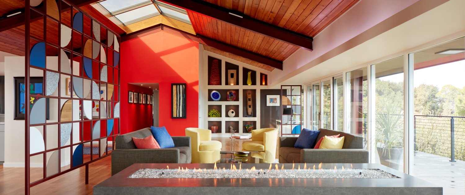Ed and Bill Fike felt restricted from enjoying the lovely view cascading from their home until they hired Harrell Design + Build to knock down a central wall, opening up their home. This remodel includes a reimagining of space, bright and bold finishes, and perhaps the star of the show; a custom art installation that acts as a functional partition to delineate their space without sacrificing their view.