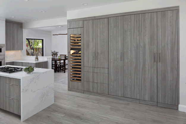 Prior to remodeling, this home had a largely unused bar and an a tiny pantry. We removed these and replaced them with a pantry wall. Made up of nearly 96″ panels, our expert designers carefully planned so everything would line up when executed. The secret pantry doors work perfectly!
