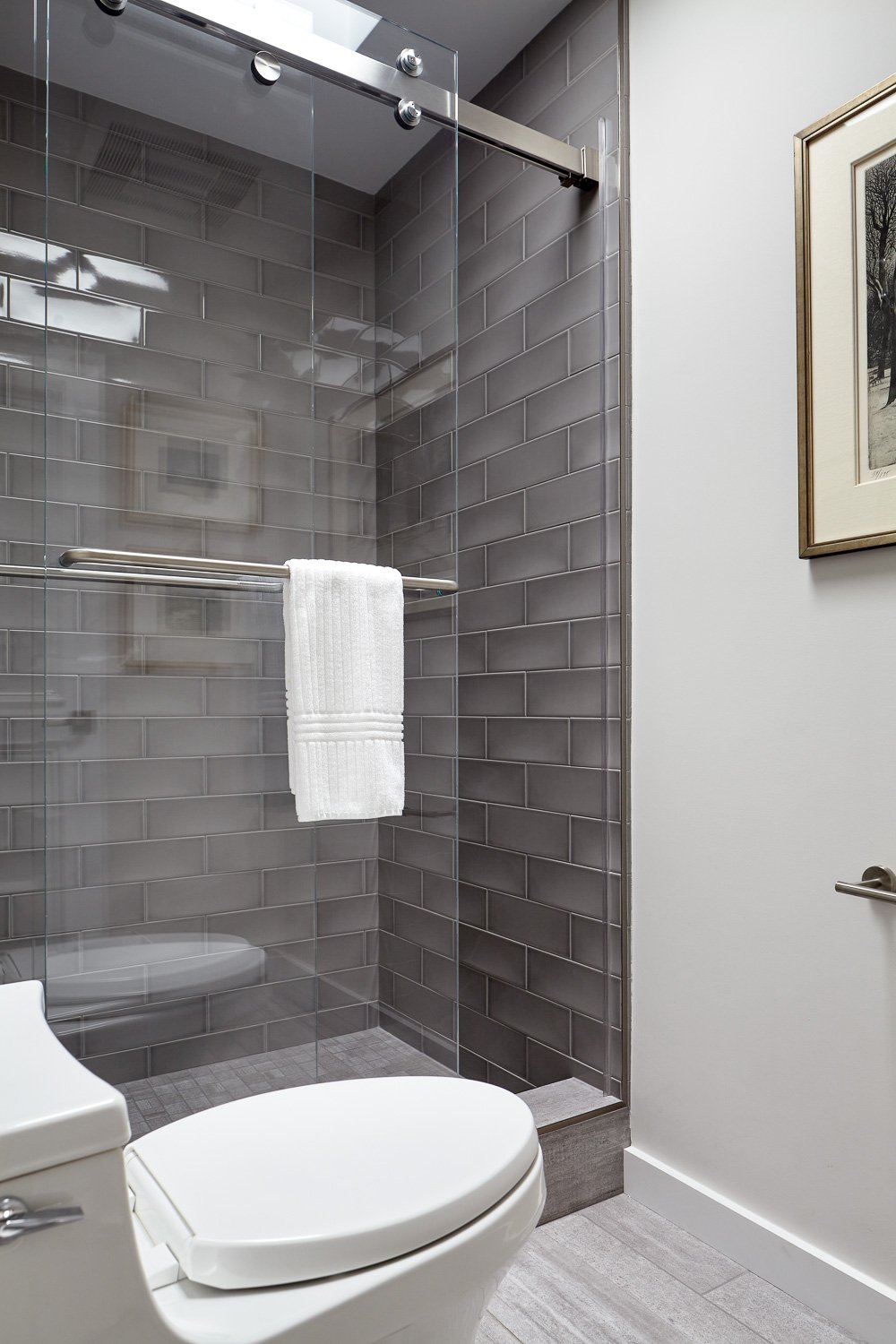 Sliding glass doors and glossy gray tiles give this Los Altos bathroom a sleek, modern feel.