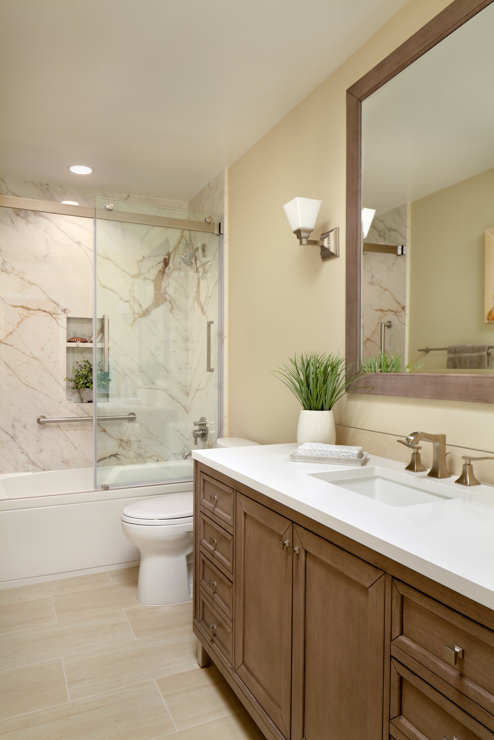 Budget-friendly finishes don't make this guest bathroom in Los Gatos feel any less sophisticated.