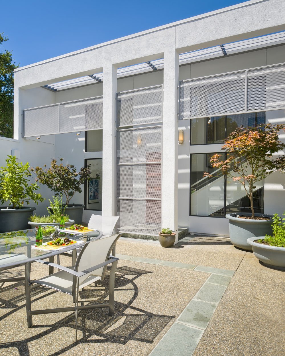 outdoor seating next to glass exterior of house