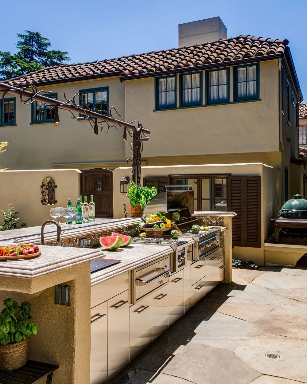 A Spanish style home in Palo Alto has an outdoor kitchen with a grill.
