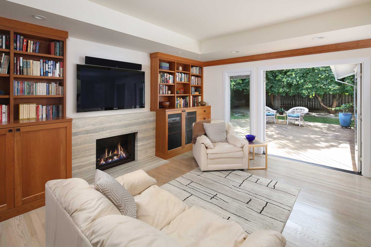 Indoor-outdoor living with built-in bookshelves and fireplace