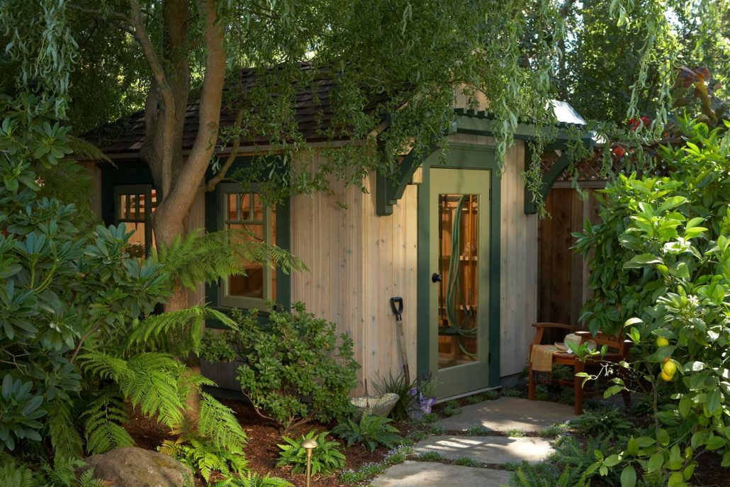 Shed hidden by lush greenery