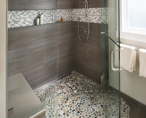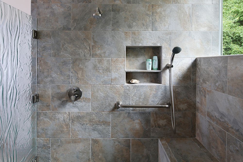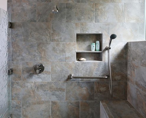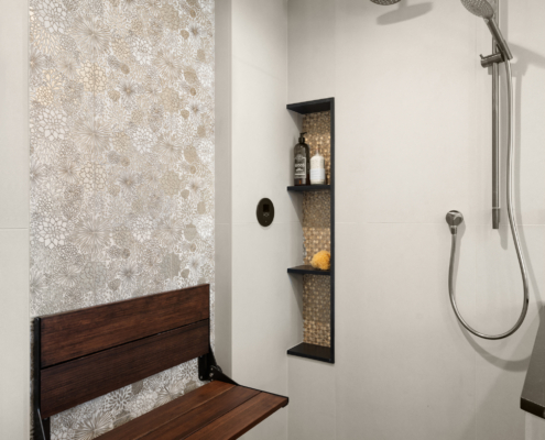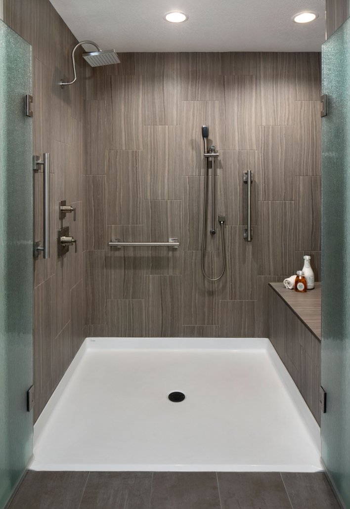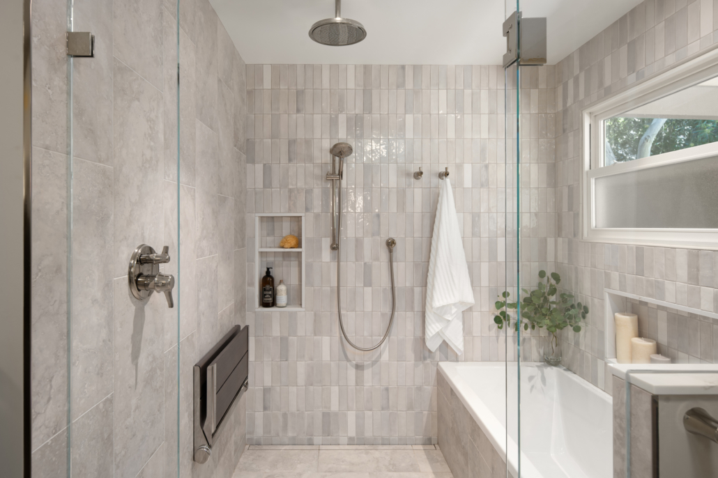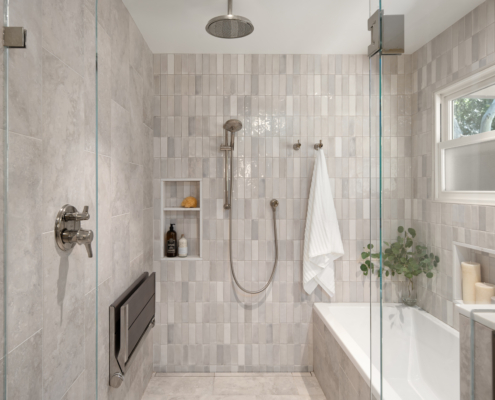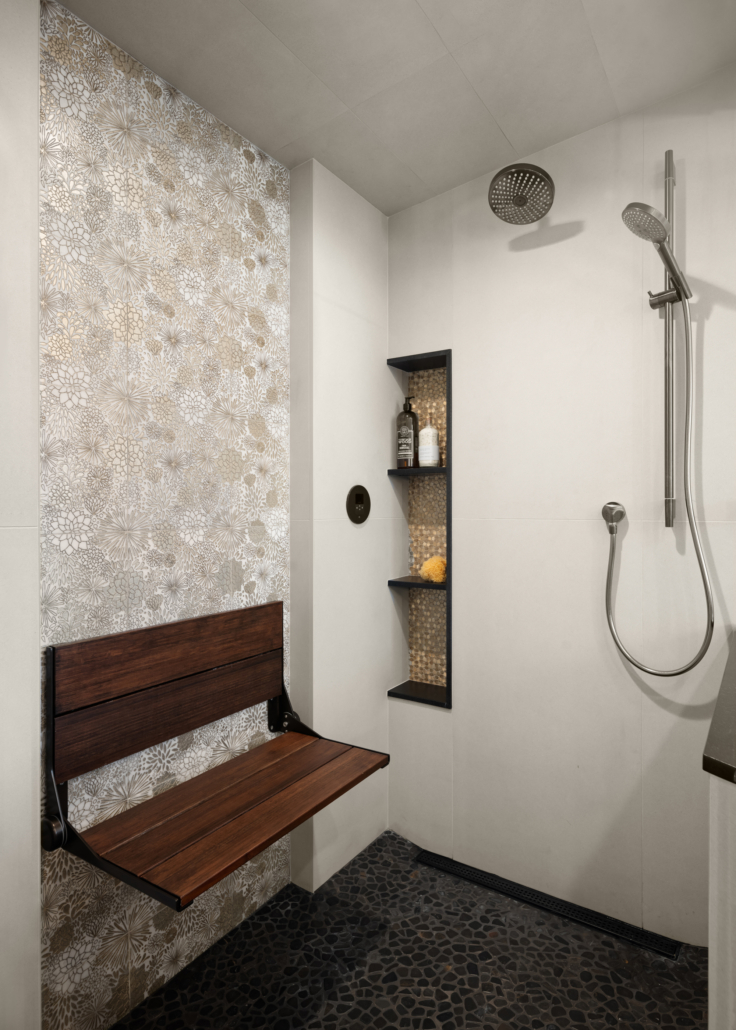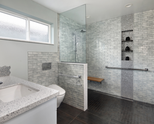 A modern, gray universal design bathroom features a curbless shower and tile details.