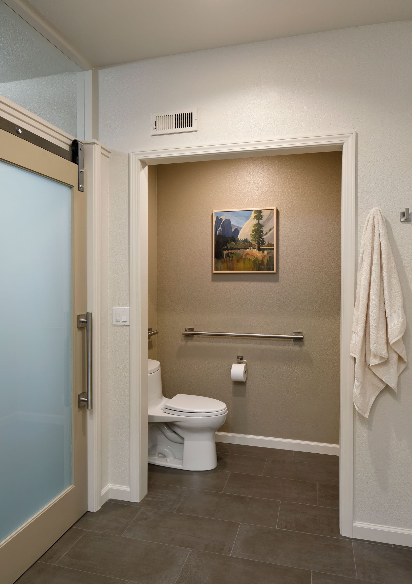 A contemporary universal design bathroom has an extra wide doorway leading to the toilet so it can be accessed by someone in a wheelchair. Brushed metal railings are on the wall to the left of and behind the toilet.