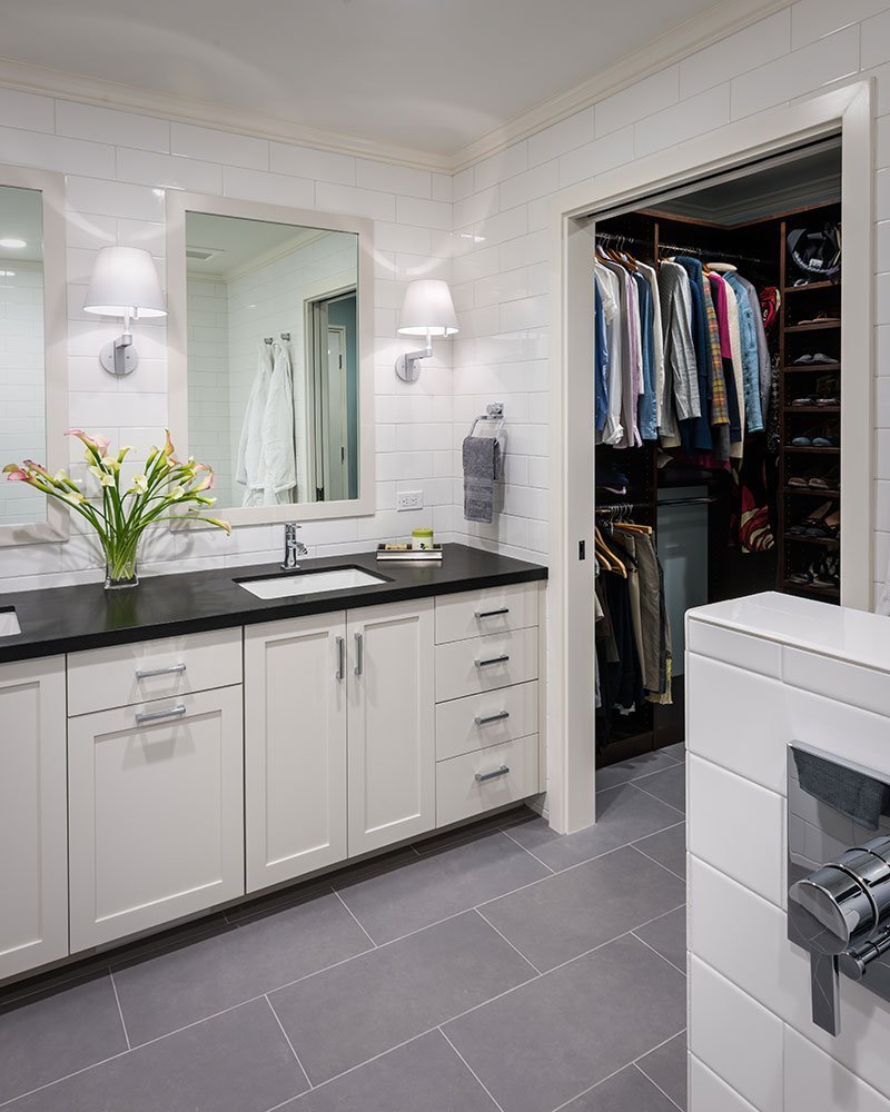 A monochromatic universal design bathroom has a walk-in closet with an extra wide doorway, accessible for wheelchair users.