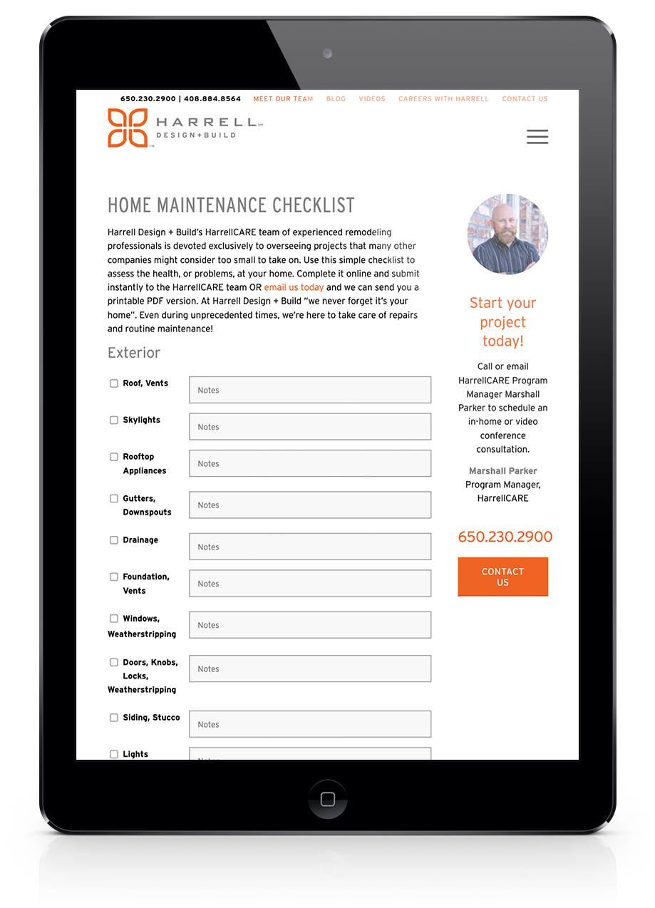 Use this simple checklist to assess the health, or problems, at your home. Complete it online and it will be submitted instantly to the HarrellCARE team. We will follow up with you! At Harrell Design + Build, “We never forget it’s your home®.” We’re here to take care of you, and your home repairs and routine maintenance.
