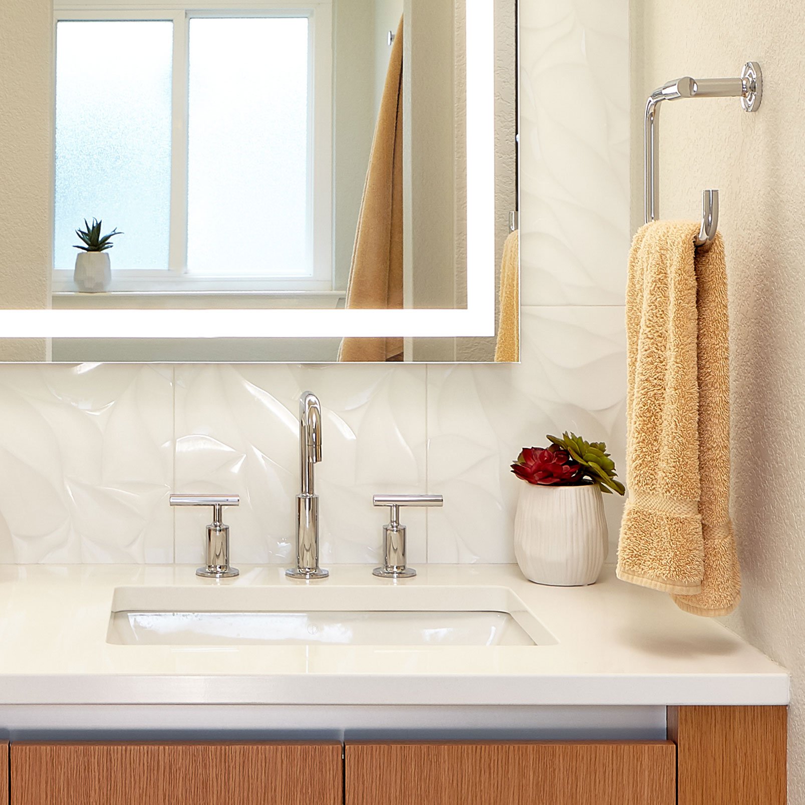 Bright sink with yellow towel hanging